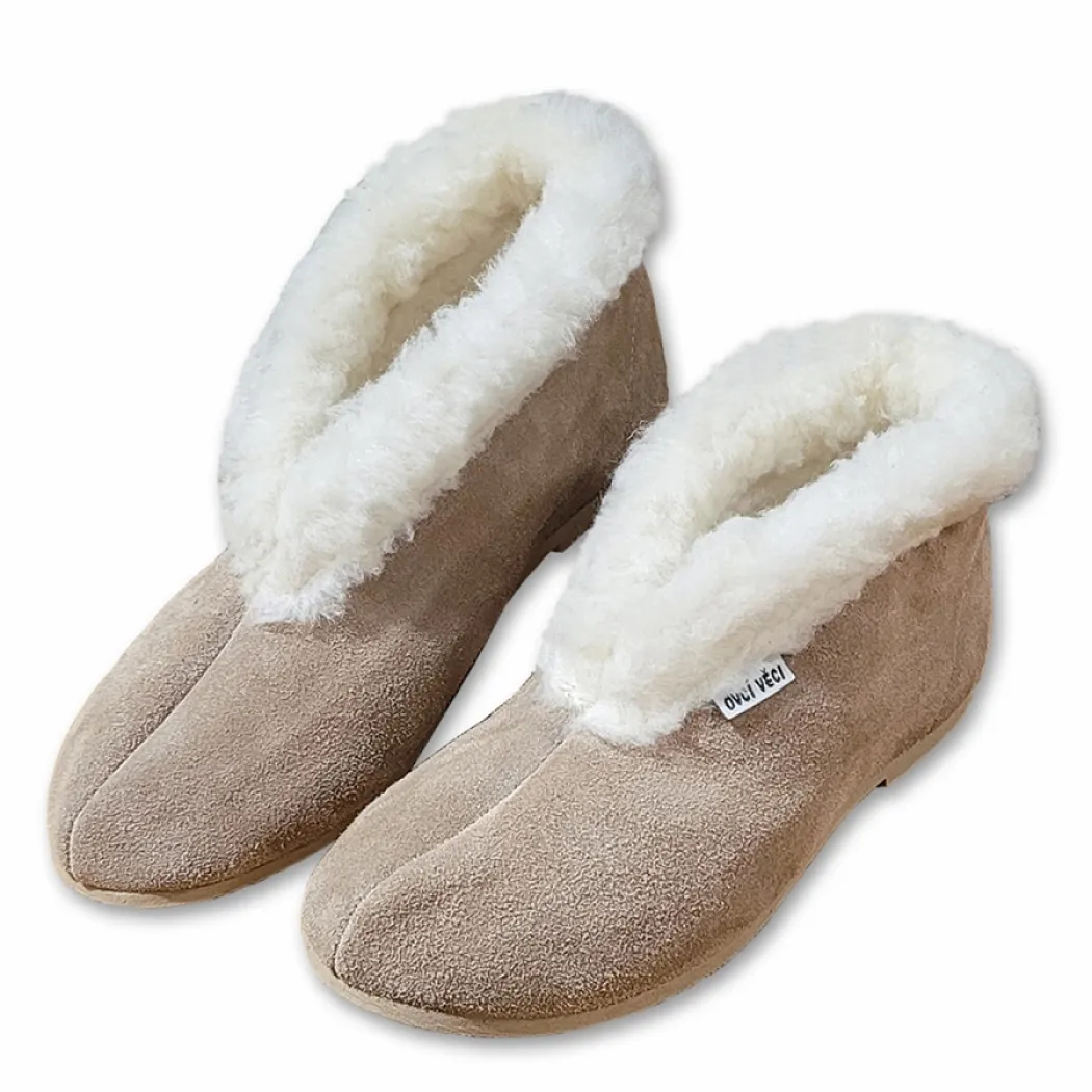 Pohodlné domácí kožené pantofle s ovčí vlnou jsou ručně šité v barvě kapučíno. Pantofle mají uzavřenou patu, a díky ovcí vlně jsou velmi pohodlné a teplé. Kožešina s ovčí vlnou, která je uvnitř celé boty je elegantně zakončené vlněným olemováním v horní části pantoflí.