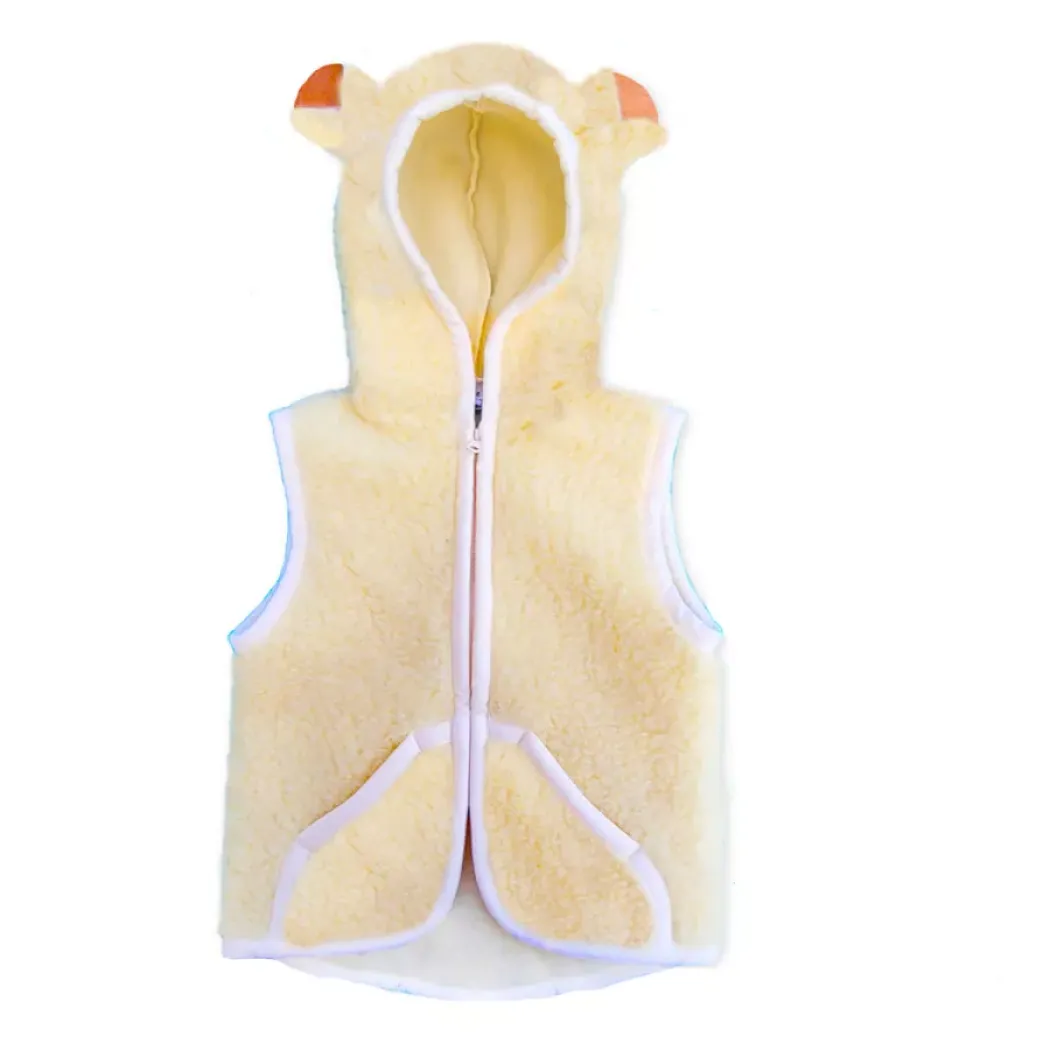 Dětská vesta z ovčí vlny se zapínáním na zip chrání vaše děti proti chladu a průvanu. Vesta má kapuci s roztomilými oušky a po stranách malé kapsičky. Díky ovčí vlně a prodloužené zadní části vestičky je vaše dítě v konstantní teplotě, která pravá ovčí vlna udržuje.