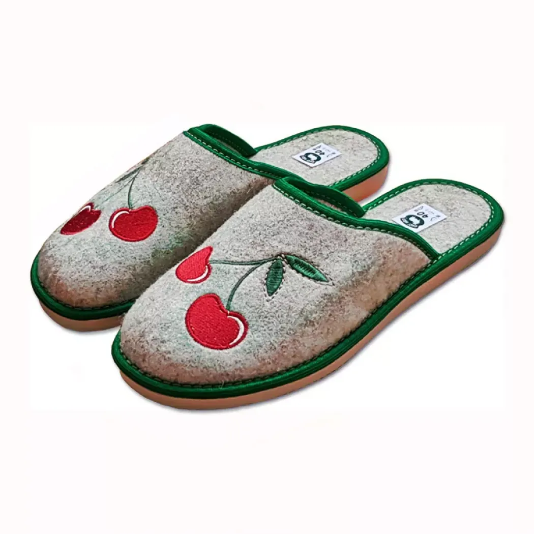 Pantofle filcové s uzavřené dámské s třešněmi. Svršek tvoří filc vyrobený ze 100% ovčí vlny. Podrážka je pryžová tlumící s ortopedickým klenutím.
