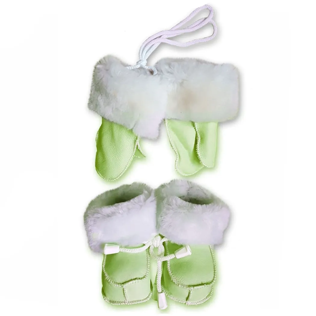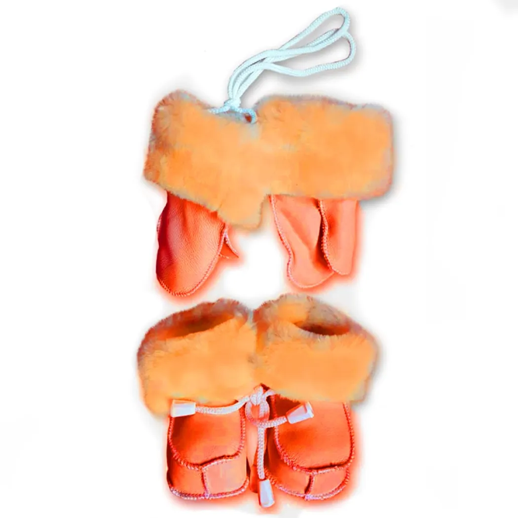 Kožené botičky a rukavičky jsou vyrobeny z jehněčí kožešiny. Vnitřek je beránek a vnějšek kůže.